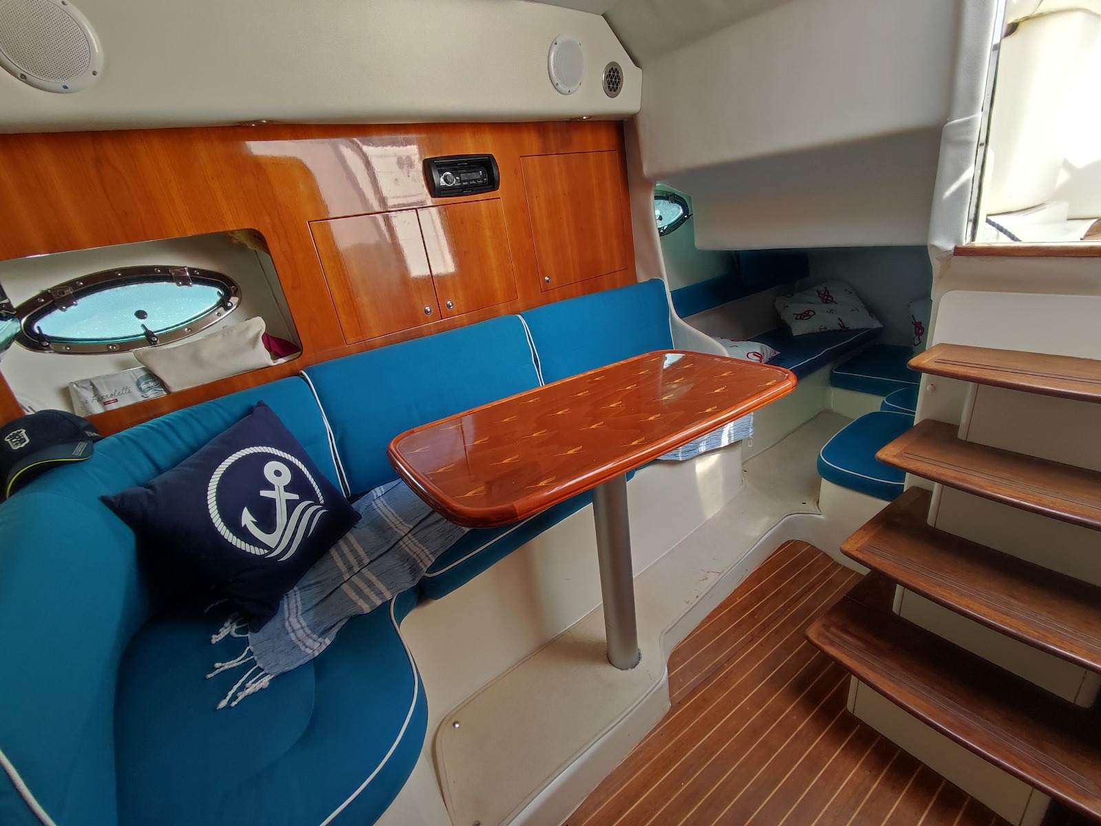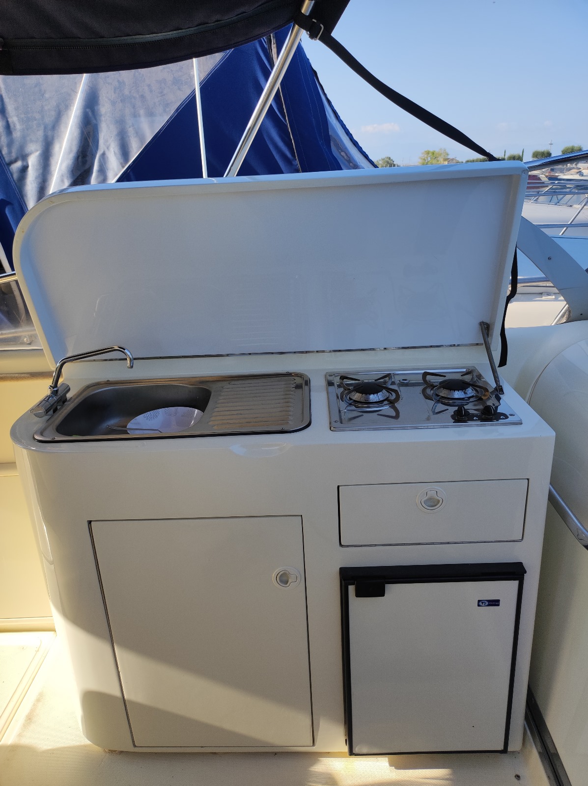 IN POZZETTO AMPIO PRENDISOLE, CON CUCINE ESTERNA 2 FUOCHI LAVELLO E FRIGORIFERO. CUSCINERIA COMPLETA PRENDISOLE A PRUA, TENDALINI E COPERTURA COMPLETA. Rifatto il pannello plancia con nuovi strumenti.